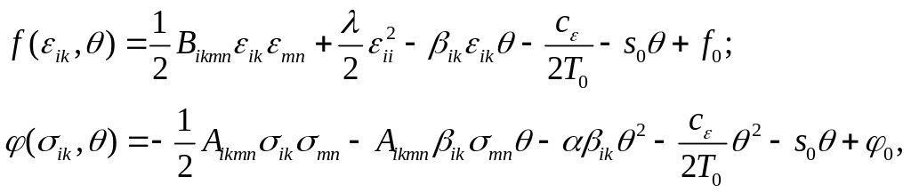 В случае малых деформаций изотропного тела при произвольном отклонении текущей температуры от начального значения выражения для плотностей свободной энергии и термодинамического потенциала Гиббса имеют вид –