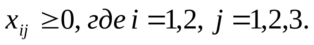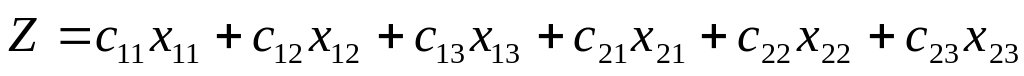 пяти линейных уравнений с шестью неизвестными и линейная функция Z. Требуется среди неотрицательных решений x11, x12, x13, x21, x22, x23 системы выбрать такое, при котором функция Z достигает наименьшего значения.