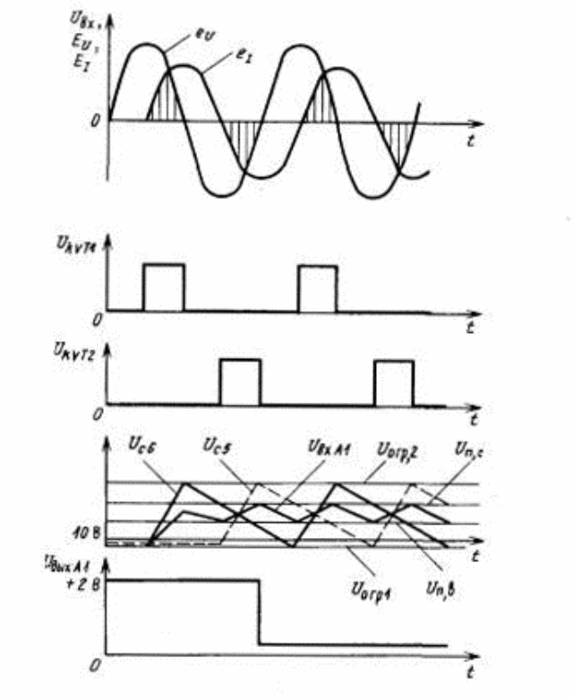 Вихідні сигнали з колекторів VT1 і VT2 проходять на часопорівнююче коло. Для VT1 вона складається з опорів R12, R14, діода VD11 і конденсатора С6, для VT2 - R13, R15, VD12 і C5. Нижні обкладки конденсаторів C5 і C6 підключені до шини +10 В, а верхні - через резистори R16 і R17 - до інвертуючого входу компаратора A1. При відсутності імпульсів, напруга на вході компаратора нижче напруги його спрацювання. На виході компаратора при цьому тримається позитивна максимальна напруга, при цьому вихідний транзистор VT3 відкритий і шунтирє обмотку одного з підключеного до нього вихідного реле 1к або 2К. Під час проходження імпульсів буде відбуватися почерговий заряд конденсаторів C5 і C6, а при їх припинення - розряд (на мал. 2.3 - це залежно UC6 і UC5). Найбільша напруга на конденсаторах, при їх зарядці, обмежується величиною Uогр 2. Його величина визначається відкриттям діодів моста VS1, після чого подальше підвищення напруги на конденсаторах припиняється. Напруження UC6 і UC5 приходять на інвертуючий вхід компаратора А1 через резистори R16 і R17, які мають рівні опори. Тому на цьому вході встановиться напруга UвхA1, рівна напівсумі напруг на конденсаторах. Параметри схеми підібрані так, що при куті зсуву 90 між ЕI і ЕU напруга на вході компаратора UвхA1 досягає його порога спрацьовування Uпс (на рис 1.3 це відбувається до кінця проходження імпульсу з виходу VT2). Щоб не сталося пере-микання компаратора і відкриття VT3 за час до спрацювання вихідного реле, напруга спрацювання компаратора знижується за рахунок зворотного зв'язку до напруги порога повернення Uпв (після його спрацьовування закриється діод VD17 і відкриється VD18). Реле РМ-11, РМ-12 мають можливість використовувати одне з двох вихідних реле: - 1К - герконові реле з підвищеною швидкодією; - 2К - електромеханічне реле з підвищеною комутаційною здатністю контактів. Перемикання здійснюється накладкою, розташованої на клемах цоколя реле (клеми 6, 3, 10). Для виставляння заданого значення кута максимальної чутливості у реле РМ-11 потрібно поставити перемикачі SB1-SB4, головки яких виведені на лицьову панель реле, в положення, відповідне обраному куту. Аналогічно на реле РМ-12 виставляється напруга спрацювання Uср.р (1, 2 або 3 В).