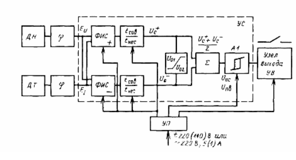 Рис. 1.1. Структурна схема реле напрямки потужності РМ-11, РМ-12: ДН - датчик напруги;- фазоповоротная схема ДП - датчик струму; ФІС - формувач імпульсів збігу миттєвих значень порівнюваних напруг (знак плюс належить до позитивних значенням, а знак мінус - до від'ємних показників цих напруг); tсов / tнс – часозрівнююче коло; U01/U02 - обмежувач рівнів напруги; - суматор; А1 - вихідний компаратор з позитивними зворотним зв'язком; УВ - вузол виходу; УП - вузол живлення