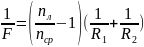 Если F - фокусное расстояние линзы, nл – показатель преломления материала линзы, n ср – показатель преломления среды, в которой находится линза, R1 и R2 – радиусы кривизны ограничивающих линзу поверхностей, то
