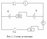 1. Скласти електричне коло за схемою, в якій ε - акумуляторна батарея, R0-змінний опір: реостат на 2-5 Ом, який включається між елементами батареї і призначений для штучного збільшення внутрішнього опору батареї та для зменшення струму короткого замикання, що проходить через батарею, коли зовнішній опір дорівнює R.