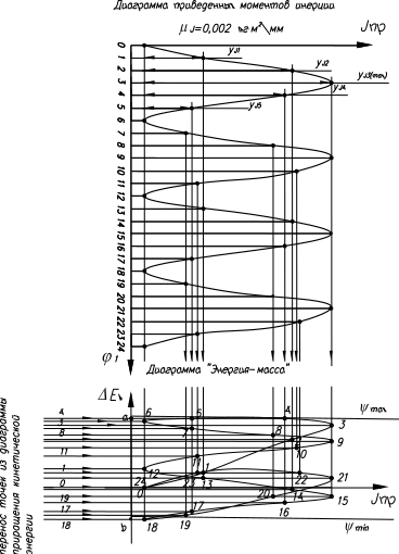 Рис. 5.9. Построение диаграммы приведенных моментов инерции механизма и диаграммы «энергия-масса» (диаграммы Виттенбауэра)