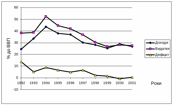 Як свідчать дані таблиці 4.1 (рис. 4.1), частка доходів бюджету у ВВП, починаючи з 1995 р., залишається приблизно сталою. З огляду на зниження реального ВВП приблизно на 10 %, слід констатувати відповідне зменшення реальних доходів бюджету за цей період.