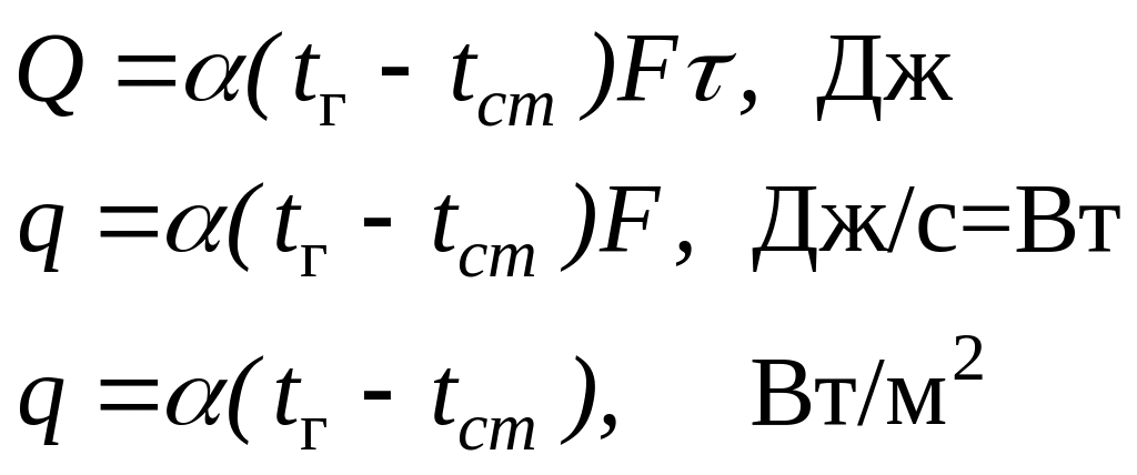 Согласно этому закону тепловой поток q от газа к стенке или от стенки к газу пропорционален разности температур между температурой газа (жидкости) tг, омывающей поверхность стенки, и температурой поверхности стенки tст, поверхности F м2, участвующей в теплообмене.