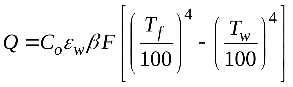Различные исследователи предложили ряд приближенных эмпирических формул для определения количества тепловой энергии, излучаемой факелом. В качестве первого приближения предлагается рассматривать факел как абсолютно черное тело, а то обстоятельство, что это не совсем соответствует действительности можно учесть введением эмпирического коэффициента β, значение которого колеблется от 0,6 до 1,0. В этом случае количество лучистого тепла, передаваемого факелом стенкам печи, можно определить по формуле /31/: