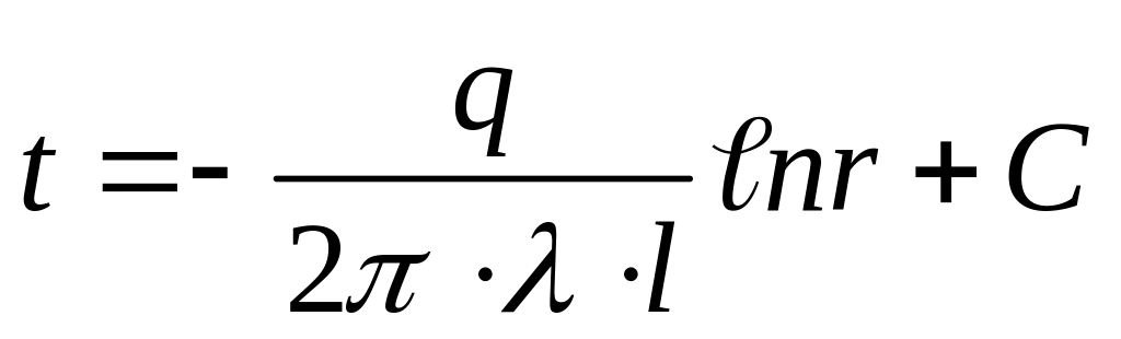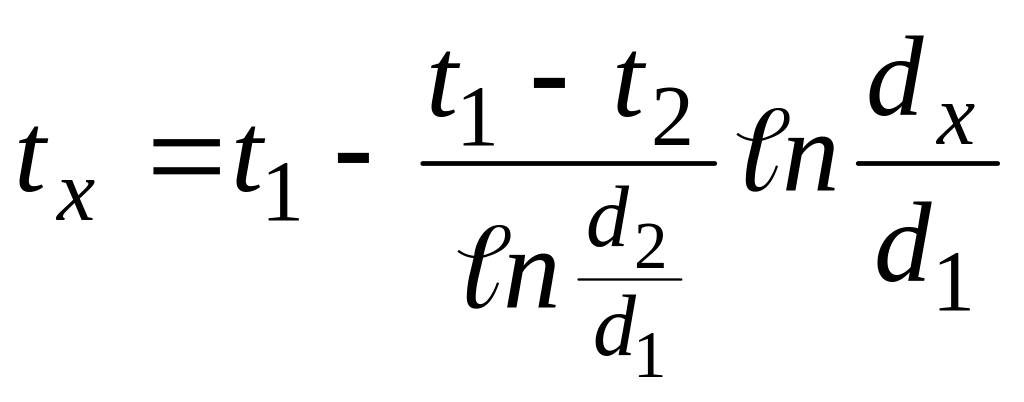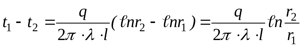 Уравнение (26) является расчетной формулой теплопроводности цилиндрической стенки. Оно остается справедливым для случая, когда t1 < t2, т.е. когда тепловой поток направлен от наружной поверхности к внутренней. Если в уравнение (с) подставить значение постоянной С уравнения (д), а значение Q из уравнения (26), то получим уравнение температурной кривой: