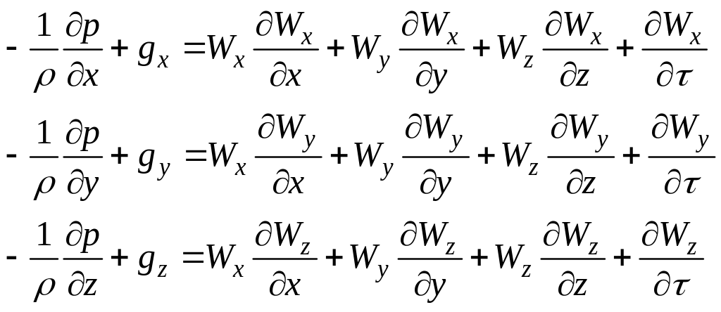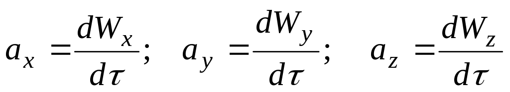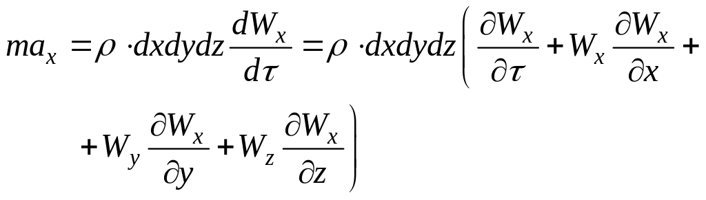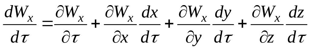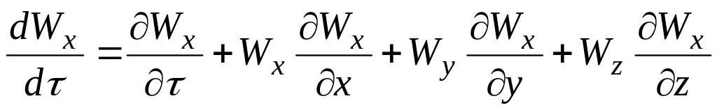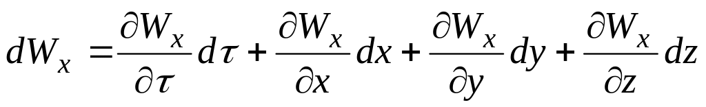 В общем случае неустановившегося движения проекции скорости являются функциями координат и времени, поэтому полный дифференциал, например, скорости dWх равен сумме четырех частных дифференциалов, а именно: