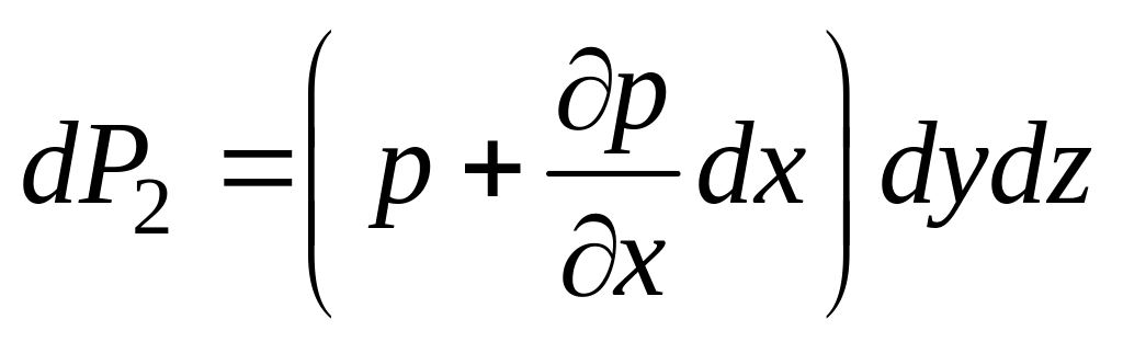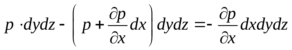 Выделим в потоке жидкости элементарный объем в форме параллелепипеда со сторонами dx, dy и dz рис.8. Напишем второй закон Ньютона для движения массы жидкости этого объема сначала в проекциях на ось ОХ: