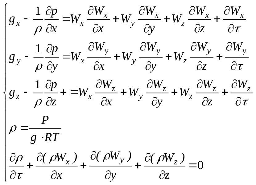 Поэтому для возможности ее решения необходимо иметь еще два условия, которые связывают между собой названные функции. Такими условиями являются уравнения неразрывности (или сплошности) и характеристическое уравнение (уравнение состояния). Итак для трехмерного стационарного потока получаем систему уравнений