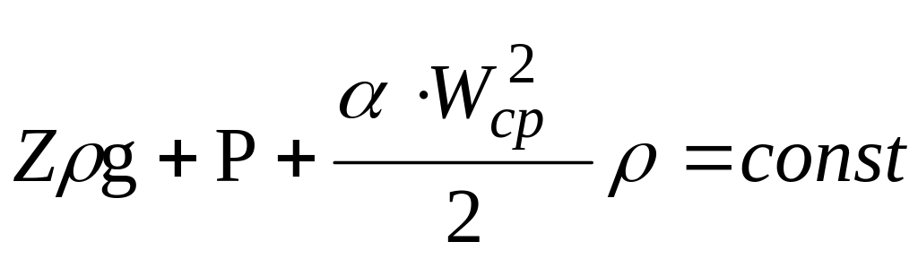 Коэффициент α зависит от неравномерности распределения скоростей по сечению и называется коэффициентом Кариолиса. Для ламинарного потока в круглой трубке, где распределение скоростей по сечению соответствует параболе, α=2. Для установившегося турбулентного течения в трубах.α = 1,1 - 1,13. Уравнение (58) было выведено для жидкости, а для газа - из предположения несжимаемого газа.