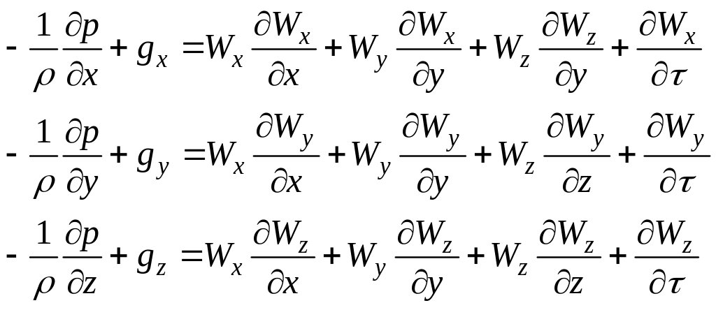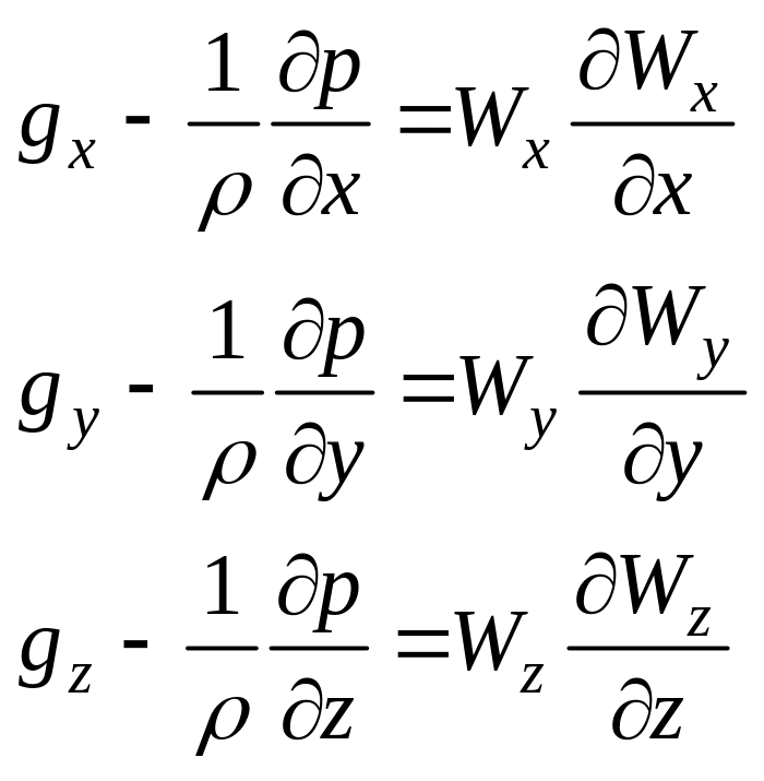 Производные характеризуют изменение скорости во времени в какой то точке, остальные три члена, стоящие в правой части уравнения, характеризуют изменение скорости при переходе от точки к точке.