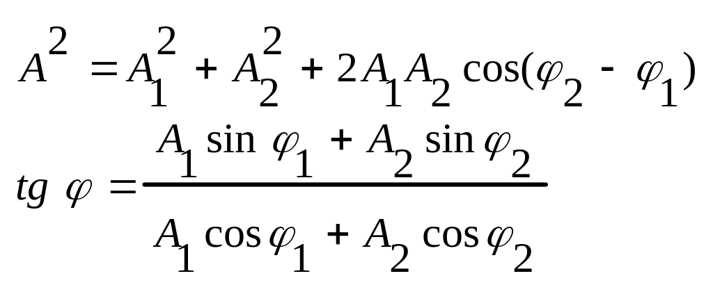 Таким образом, тело, участвуя в двух гармонических колебаниях одного направления и одинаковой частоты, совершает также гармоническое колебание в том же направлении и с той же частотой что и складываемые колебания. Амплитуда зависит от разности фаз.