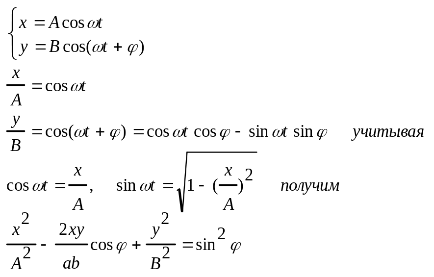 Рассмотрим результат сложения колебаний одинаковой частоты ,происходящих во взаимно перпендикулярных направлениях. Начальную фазу первого колебания примем = 0.