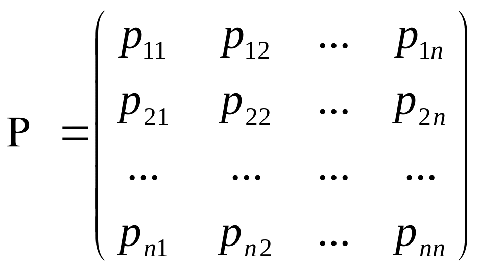 Цепь Маркова называют однородной, если условная вероятность рij(k) не зависит от номера испытания; в этом случае вместо нее пишут рij и называют ее переходной вероятностью. Все переходные вероятности могут быть представлены матрицей перехода системы, имеющей следующий вид: