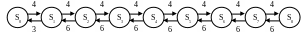 Решение. В данном случае СМО имеет два канала обслуживания; λ=4 кл/ч; µ=3 кл/ч; m=6. Пусть s0 – СМО свободна; s1 – один врач занят, очереди нет; s2 – оба врача заняты, очереди нет; s3 – оба врача заняты, один больной в очереди; s4 – оба врача заняты, два больных в очереди; s5 – оба врача заняты, три больных в очереди; s6 – оба врача заняты, четыре больных в очереди; s7 – оба врача заняты, пять больных в очереди; s8 – оба врача заняты, шесть больных в очереди. Граф состояний имеет следующий вид: