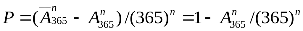 Задача о днях рождения. Пусть в аудитории находится n студентов. Какова вероятность того, что хотя бы у двух студентов совпадают дни рождения (считать, что в году 365 дней).