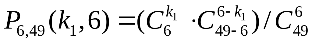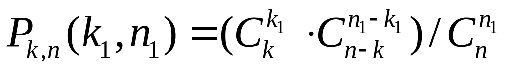 Гипергеометрическое распределение. Дана совокупность из n объектов, среди которых k отмеченных (например, бракованных изделий, выигрышных билетов и т.д.). Выбирается наугад n1≤n объектов. Какова вероятность того, что среди них окажется k1 отмеченных?