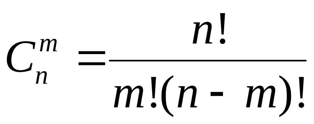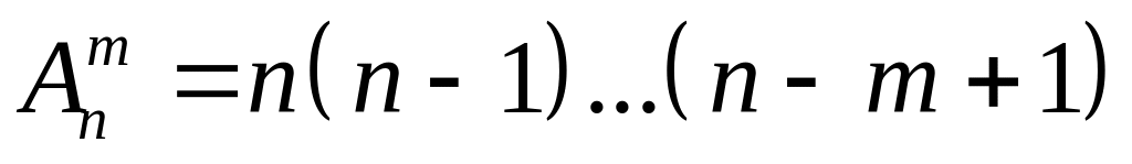 Формулу (1.3.2) можно обосновать следующим образом. Первый элемент в размещении из n элементов по m можно выбрать n способами, второй (после выбора первого) можно выбрать (n-1) способами, третий – (n-2) способами и т. д., m-й – (n-m+1) способами. Варьируя способы выбора 1-го элемента со способами выбора 2-го, со способами выбора 3-го элемента и т. д. и, наконец, со способами выбора m-го элемента, получим n(n - l) ... (n-m+ 1) способов.
