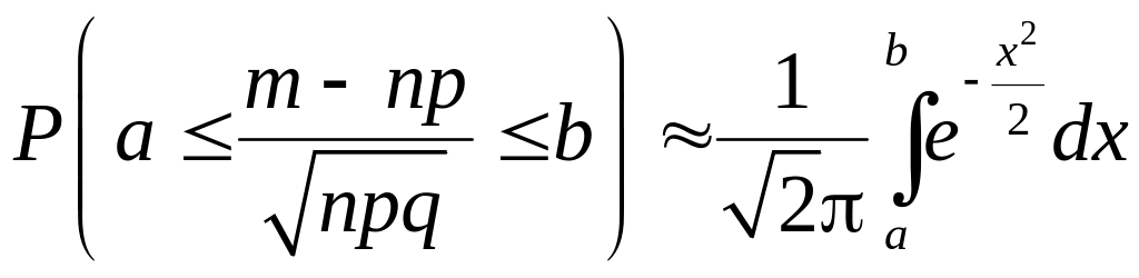 Однако практически при большом числе испытаний n и не слишком малой вероятности p нас редко интересует вероятность того, что "успех" наступит точно m раз; наиболее важно оценить вероятность того, что число "успехов" лежит в некотором интервале. Такую вероятность можно оценить с помощью интегральной теоремы Муавра-Лапласа.