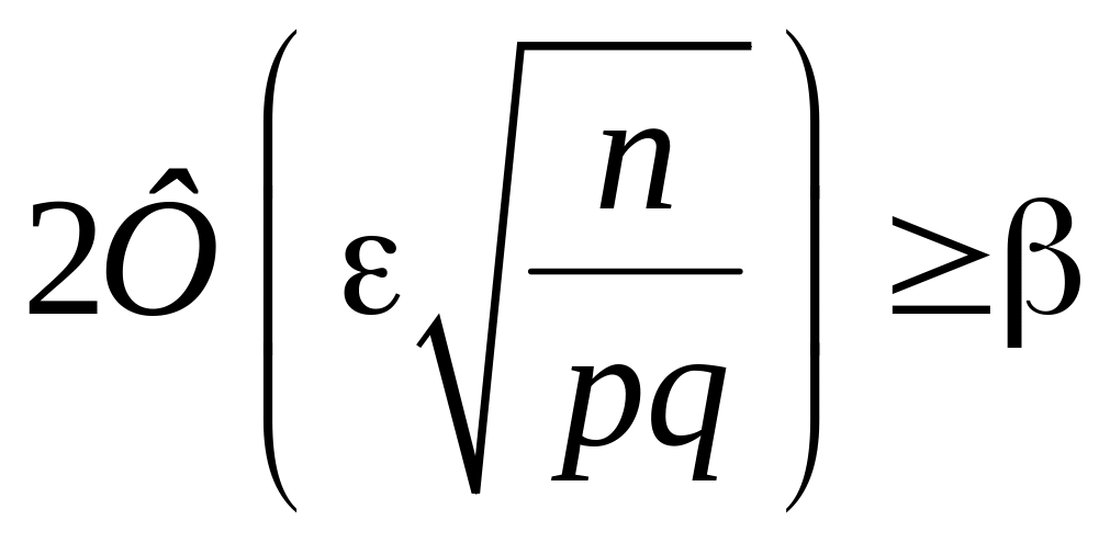 Если же требуется определить, какое наименьшее число испытаний надо произвести, для того чтобы с вероятностью, не меньшей β, частота m/n появлений успеха отклонялась от вероятности ρ по модулю не больше, чем на ε, требуемое n определяем, решив неравенство