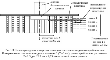 2.4 Последовательно переставляйте пластину на линию №2, 3 и т.д (увеличивая расстояние от плоскости датчика по оси Y каждый раз на 2,5 мм), и повторите измерения согласно п.2.3, до тех пор пока датчик не перестанет срабатывать. Полученные результаты занесите в табл.1.1.