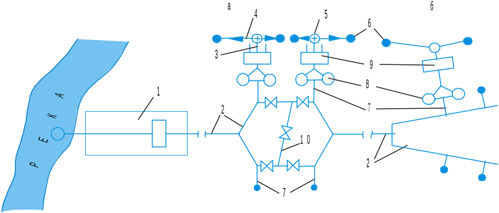 Рис.10.2.1. - Кольцевая (а) и лучевая (б) водораспределительные системы
