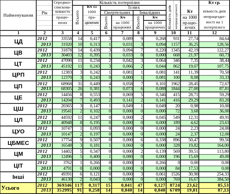 Середній коефіцієнт частоти та коефіцієнт тяжкості випадків травматизму за 2013 рік становлять Кч1000 = 0,258; Кт1000 = 19,01