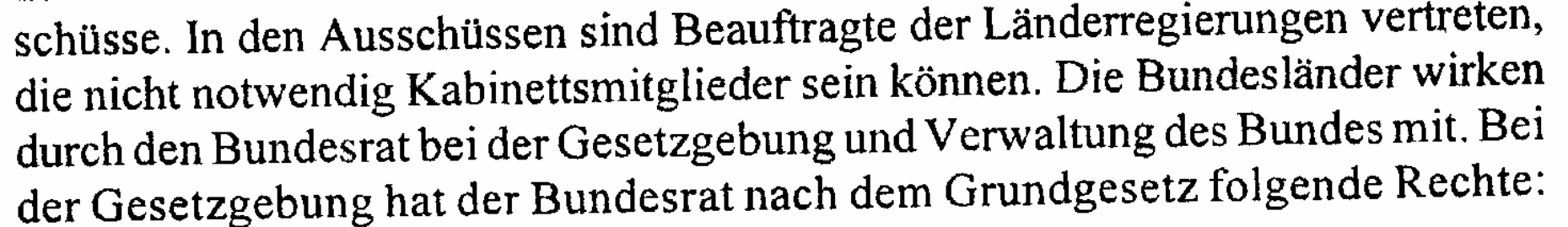 1) Er kann beim Bundestag Gesetzvorlagen einbringen; 2) Er kann gegen Gesetz- beschlüsse des Bundestages Einspruch erheben. Wenn der Bundesrat Einspruch erhebt, geht das Gesetz nochmals an den Bundestag zurück; 3) Seiner Zustimmung bedürfen verfassungsändernde und föderative Gesetze; 4) Er kann den Vermittlungsausschuß anrufen; 5) Er wirkt bei der Notstandsgesetzgebung mit.