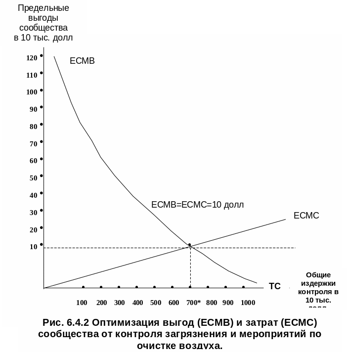 Как видно из таблицы 6.4.1 предельные выгоды сообщества (ЕСМВ) уравновешиваются с предельными экологическими издержками сообщества (ЕСМС) на уровне 10 (100 тыс. долларов), обеспечивая чистую выгоду контроля и мероприятий по очистке воздуха на сумму 2,58 млн. долларов при общих затратах в 7 млн. долларов.