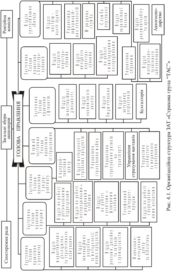 Одним з молодих страховиків є ПАТ «Страхова група “ТАС”», яка завдяки успішному менеджменту вже ввійшла за обсягом наданих страхових послуг до першої п’ятірки. Організаційну структуру цього формування наведено на рис.