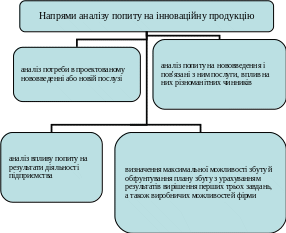 В умовах ринкової економіки аналіз попиту на наукоємну продукцію має першорядне значення. Аналіз попиту на нововведення проводиться в наступних напрямках: