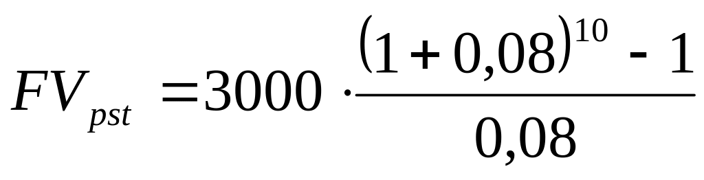 Рассчитаем сколько заплатит арендатор спустя 10 лет при ежегодных равных платежах 3000 долл. В данном случае используется формула оценки постоянного аннуитета (схема постнумерандо). Аннуитет называется постоянным, если все денежные поступления равны между собой.