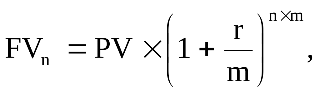 Начисление процентов (дивидендов и друб.) может осуществляться ежедневно, ежемесячно, поквартально, раз в полугодие и раз в год. Чем больше количество раз в течение года будут начисляться проценты, тем больше будет FV в конце n-го периода. В инвестиционном анализе отношение r/m принято рассматривать в качестве целой процентной ставки, а произведение n × m - в качестве срока инвестирования.