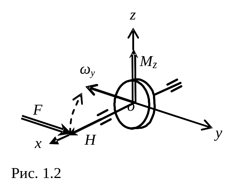 Используя указанное правило легко найти направление прецессии оси гироскопа. Пусть к гироскопу приложена некоторая сила F (рис. 1.2). Для решения поставленной задачи следует определить направление момента Мz этой силы и воспользоваться приведенным правилом. В результате нетрудно установить, что прецессия гироскопа будет происходить вокруг оси оу с угловой скоростью ωу.