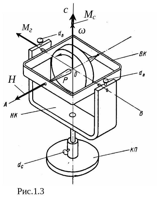 В свою очередь, кольцо ВК устанавливалось в наружном кольце НК подвеса с помощью двух опор, расположенных по оси ОВ. Благодаря такой схеме обеспечивается свобода вращения ротора Р вместе с кольцом ВК в наружном кольце НК вокруг внутренней оси подвеса 0В. Наконец, наружное карданово кольцо НК, также с помощью двух опор, расположенных по оси ОС, устанавливалось на основании КП прибора, обеспечивая свободу вращения ротора Р вместе с обоими кардановыми кольцами ВК и НК вокруг наружной оси подвеса ОС. Таким образом, указанный подвес обеспечивает ротору три вращательных степени свободы, в результате чего такой гироскоп называют трехстепенным.