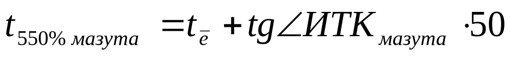 Температура отгона 50% остатка определяется как сумма температуры то линии ИТК, соответствующей доле отгона низкокипящей фракции, и произведения величины найденного угла наклона линии ИТК для остатка на 50, т. е. (в 0C)