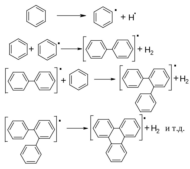 Последующая полициклизация бензола, образовавшегося по этой схеме, сопровождается отщеплением водорода и ассоциацией фенильных радикалов. Она приводит к формированию полициклических конденсированных углеводородов. Образование плоских конденсированных молекул из ароматических колец, по-видимому, представляет собой цепной радикальный процесс, протекающий через промежуточное образование углеводородных радикалов с высокой степенью делокализации неспаренного электрона с их последующей конденсацией: