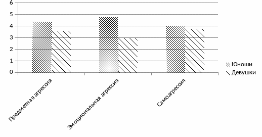 Средние показатели юношей превалируют над показателями девушек по следующим шкалам, предметная агрессия, эмоциональная агрессия и самоагрессия. По шкале предметная агрессия среднее значение у юношей составило 4,4 балла, тогда как у девушек оно равнялось 3,6. Шкала эмоциональная агрессия ничем не отличилась именно в том, что среднее значение вновь оказалось выше у юношей, и составило 4,8, а у девушек 3 балла. Эти данные дают понять, что девушки в меньшей степени срывают свою агрессию на предметах, они больше находятся в мире и согласии с собой, реже возникает эмоциональное отчуждение при общении с другими людьми.