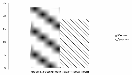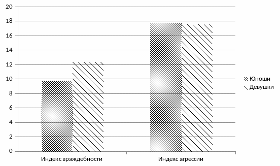 Среднее значение индекса агрессии у юношей составил 17,8., а у девушек среднее индексу агрессии равнялось 17,6. Различия между их индексами агрессии не превышало 0,2.