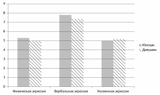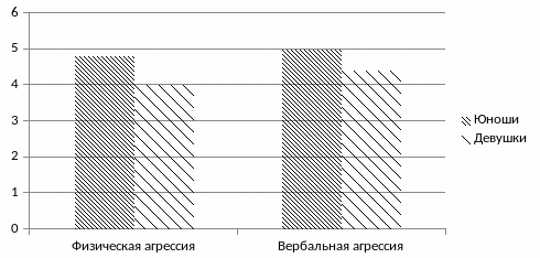 По таким шкалам, как физическая и вербальная агрессии был выявлены различия. В выборке молодых людей средние значения по данным шкалам выше средних значений девушек. Среднее по шкале физическая агрессия у девушек оказалось равным 5, а у юношей среднее значение составило 5,3. Что касается вербальной агрессии, среднее значение у юношей равно 7,8, а у девушек не превышает 7,4. Таким образом, молодые люди чаще девушек выражают свою агрессию с помощью слов и использования физической силы против другого лица.