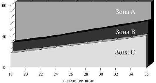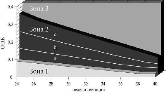 Более точно и в более ранние сроки беременности (начиная с 24 нед) оценить тяжесть гемолитической болезни плода возможно при исследовании оптической плотности билирубина в амниотической жидкости при различных длинах волн света (от 300 до 700 нм) с помощью спектрофотометра. Полученные значения интерпретируют по шкале Лили, которая делится на зоны: 1, 2А, 2В, 2С, 3 (рис. 32.21).