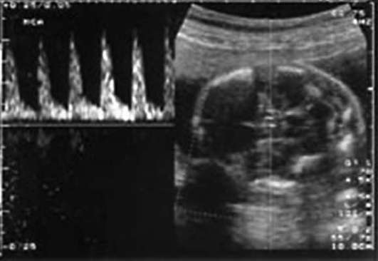 В настоящее время доказана обратная корреляционная связь между максимальной скоростью кровотока в средней мозговой артерии и уровнем гемоглобина у плода. Высокая максимальная скорость кровотока в средней мозговой артерии объясняется увеличением сердечного выброса, обусловленного анемией и снижением вязкости крови при гемолитической болезни (рис. 32.19). Это стало основанием для использования максимальной скорости кровотока в средней мозговой артерии плода в качестве дополнительного критерия при диагностике гемолитической болезни плода и позволяет снизить частоту применения инвазивных диагностических процедур (амниоцентез, кордоцентез) (рис. 32.20).