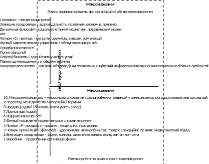 Якщо розглянути маркетингове поле вцілому (у просторі ринкових відносин, що виникають при поділі та кооперації праці в процесі спільної трудової діяльності асоційованих власників, і відносин найму, що виникають між власниками і користувачами засобів виробництва), то можна представити мікромаркетинг як переклад в операційні терміни менеджменту, а макромаркетинг як маркетингове управління, пов'язане з регулюванням попиту, що, у свою чергу, пов'язане з регулюванням відносин зі споживачами в умовах макросередовища.