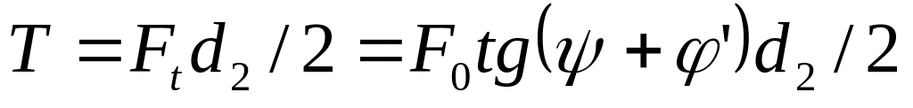 Т – момент сопротивления в резьбе, определяемый по окружной силе Ft, приложенной по касательной к окружности среднего диаметра d2 резьбы: