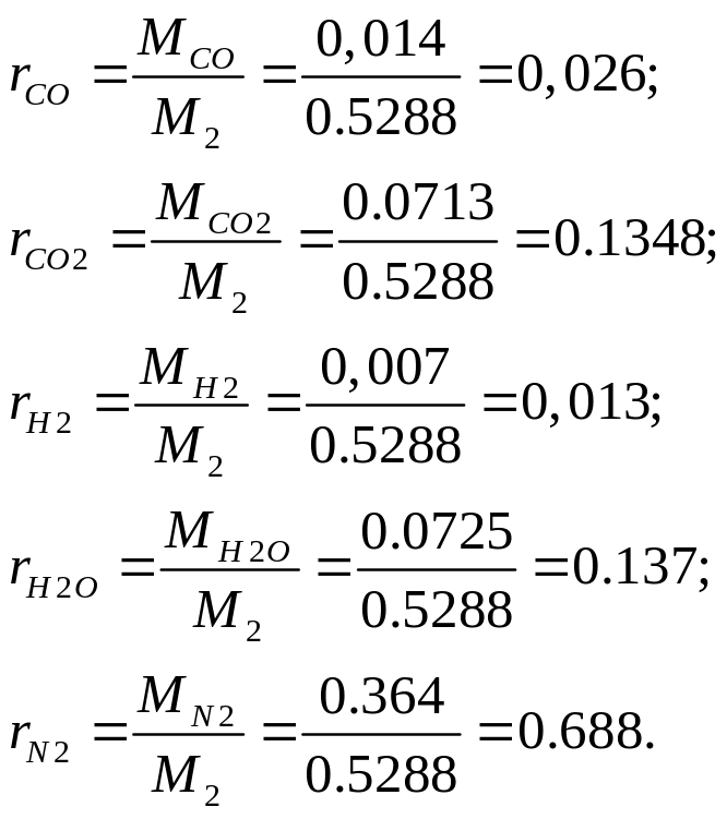 Мольные или объёмные доли компонентов продуктов сгорания: