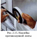 Перед установкой подоконного отлива необходимо наклеить уплотнительную ленту на тыльную сторону подоконного отлива. Во избежание возникновения "барабанной дроби" об отлив во время дождя, на нижнюю сторону отлива может быть наклеена противошумная лента (рис. 2.15).