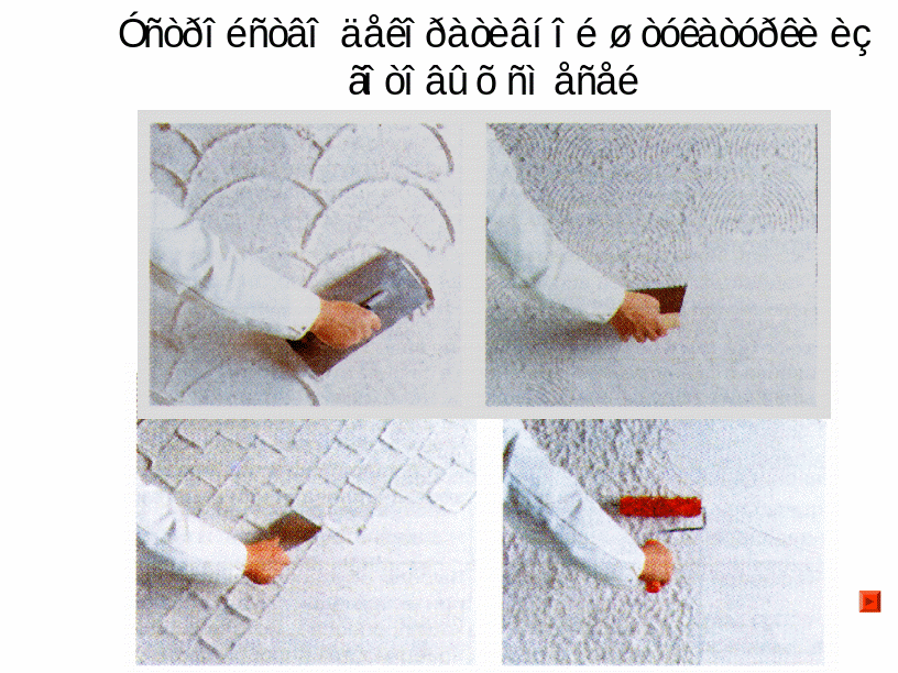 Структурирование материала производится различными инструментами до получения ярко выраженной фактуры поверхности (рис. 2.33). Периодически необходимо удалять излишки раствора, образующиеся на рабочей поверхности пластиковой терки.