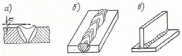 Рис. 3. Дефекты макроструктуры в швах а - стыковых; б - угловых; в - нахлесточных; 1 - непровар; 2 - трещины; 3 - поры; 4 — шлаковые включения