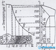 Рис. 4. Схема распределения структур в сварном шве и околошовной зоне (цифрами I, II, III и т.д. обозначены одни и те же участки на разрезе шва, кривой распределения температур и шкале температур на диаграмме железо-углерод) I - неполное расплавление; II - перегрев; III - нормализация; IV - неполная перекристаллизация; V - рекристаллизация; VI - синеломкость